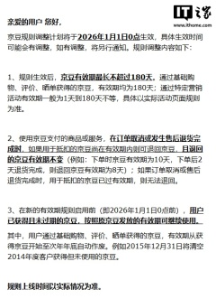 京东宣布 2026 年起调整京豆规则:有效期最长 180 天,次年底自动作废
