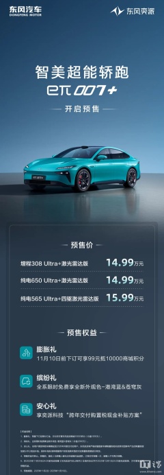 东风奕派“智美超能轿跑”eπ007+ 预售:标配激光雷达、骁龙 SA8295P 车规级芯片,14.99 万元起