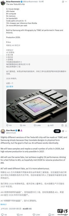 马斯克:特斯拉 AI5 芯片由台积电 + 三星双厂代工,计划 2026 年试产、2027 年大规模量产